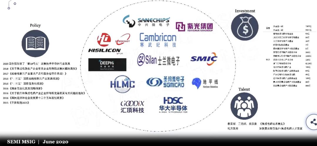 紫光集團、寒武紀、中興微電子等國內(nèi)半導(dǎo)體企業(yè)政策上給予幫助,有很多政府支持項目,同時,專項基金、產(chǎn)業(yè)基金等基金方面為半導(dǎo)體公司提供資金援助。由此引出更多潛在助力,教育部、工信部和發(fā)改委創(chuàng)造一個培養(yǎng)環(huán)境,地方政府加快落實吸引海外集成電路人才政策。