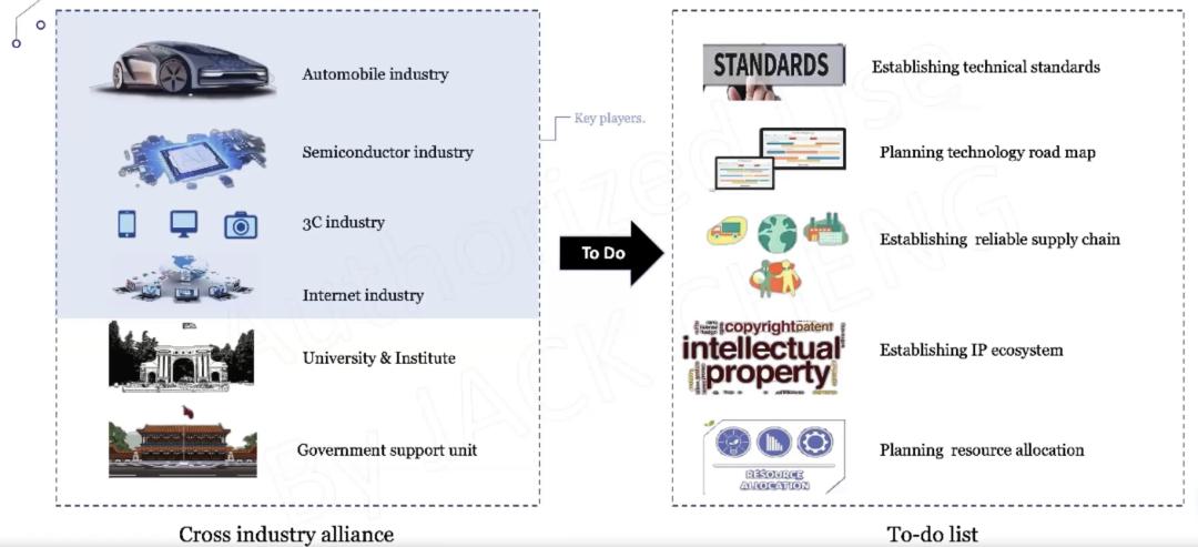 未來在這方面會有一個跨行業(yè)戰(zhàn)略聯(lián)盟,汽車產(chǎn)業(yè)、半導(dǎo)體產(chǎn)業(yè)、三級產(chǎn)業(yè)、互聯(lián)網(wǎng)產(chǎn)業(yè)還有政府、學(xué)校,三方一起要做到的是:一起制定標準的規(guī)格;制定路徑;供應(yīng)鏈重整;照顧到IP;制定資源分配。