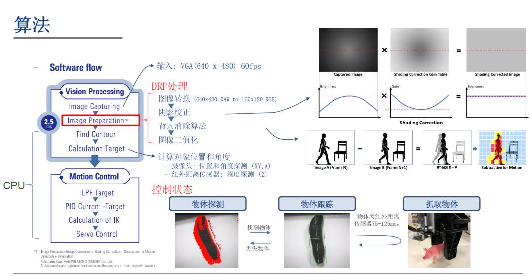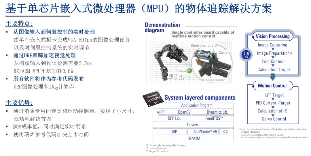 這次參展的超低功耗快速響應(yīng)物體追蹤方案,又一次體現(xiàn)了瑞薩廣泛的技術(shù)積累與深厚的用戶應(yīng)用需求洞察力。該方案采用瑞薩電子獨(dú)家的動(dòng)態(tài)可配置處理器(Dynamically Reconfigurable Processor,簡(jiǎn)稱DRP),從圖像輸入到檢出物體僅需要2.5毫秒,處理器的平均功耗僅為0.6毫瓦。利用DRP,這款方案不需要專有視頻與運(yùn)動(dòng)控制器,僅需單個(gè)微處理器就能完成圖像處理與伺服控制,總體方案尺寸小、功耗低,總體物料成本也更低,但仍能滿足追蹤功能的實(shí)時(shí)性要求,可以處理60幀每秒的VGA視頻。