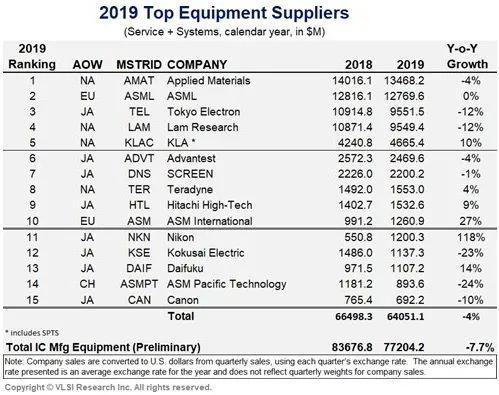 2019前十五大半導(dǎo)體設(shè)備商