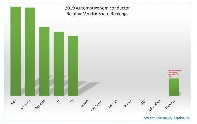 據(jù)Strategy Analytics研究數(shù)據(jù)顯示,在2019年汽車半導體廠商市場份額排行榜中,恩智浦榮登榜首。