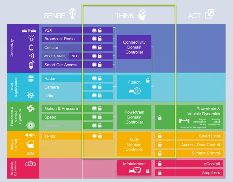 目前汽車已經(jīng)實現(xiàn)了從“每一個應(yīng)用都是一個處理系統(tǒng)”到控制域的演進。汽車內(nèi)部有5個重要控制域,包括動力傳動、車身、連接、自動化、車載信息娛樂等,恩智浦在其中扮演了非常重要的角色。