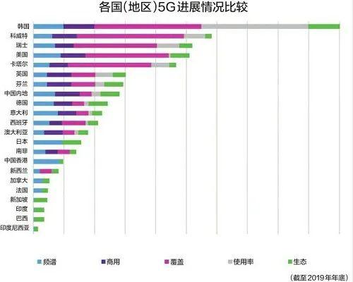 從圖1可以看到,韓國在5G領(lǐng)域的綜合實(shí)力處于領(lǐng)先地位。韓國在運(yùn)營商投放、網(wǎng)絡(luò)覆蓋率、用戶使用率、5G頻譜可用性和監(jiān)管生態(tài)系統(tǒng)這五項(xiàng)指標(biāo)中的表現(xiàn)都超出了預(yù)期。