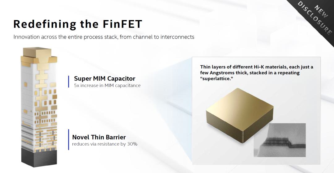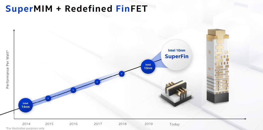 以10納米SuperFin技術(shù)為例,通過(guò)英特爾增強(qiáng)型FinFET晶體管與Super MIM(Metal-Insulator-Metal)電容的結(jié)合,該技術(shù)能夠提供增強(qiáng)的外延源極/漏極、改進(jìn)的柵極工藝和額外的柵極間距,并通過(guò)以下方式實(shí)現(xiàn)更高的性能: