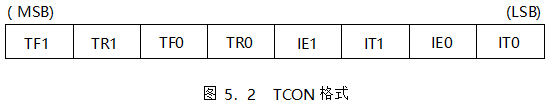 TCON 為內(nèi)部定時器/計數(shù)器 T0 、T1 的控制寄存器,其字節(jié)地址為 88H ,位地址為 88H~8FH ,圖 5.2 示出了 TCON 各位的定義。