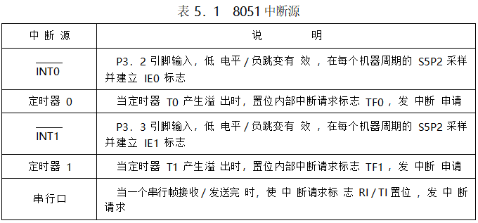 MCS 51 單片機的中斷系統(tǒng),是 8 位單片機中功能最強的一種 。由圖 5.1 可知,8051 提供了 5 個中斷源(8052 提供了 6 個), 其作用如表 5.1 所示。