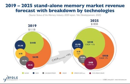 存儲(chǔ)器是現(xiàn)代信息系統(tǒng)最關(guān)鍵的組件之一,在當(dāng)前物聯(lián)網(wǎng)與人工智能聯(lián)合推動(dòng)下的數(shù)據(jù)爆發(fā)時(shí)代,存儲(chǔ)器行業(yè)的“加速鍵”隨之開(kāi)啟。據(jù)YOLE統(tǒng)計(jì),自2019年以來(lái),存儲(chǔ)器成為半導(dǎo)體增速最快的細(xì)分行業(yè),總體市場(chǎng)空間從2019年的1110億美元將增長(zhǎng)至2025年的1850億美元。細(xì)分市場(chǎng)中,以FeRAM(鐵電存儲(chǔ))和ReRAM(電阻式存儲(chǔ))為代表的新型存儲(chǔ)器市場(chǎng)增速最快,將從5億美元增長(zhǎng)到40億美元,年復(fù)合增長(zhǎng)率達(dá)到42%,發(fā)展?jié)摿薮蟆?