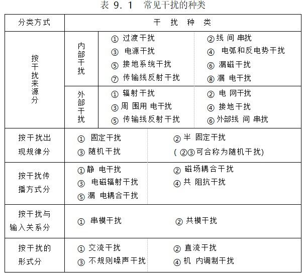 另外,干擾還可以從形式、產(chǎn)生和傳播方式等方面進(jìn)行分類,參見表 9.1 。盡管干擾的分類多種多樣,在單片機(jī)應(yīng)用系統(tǒng)中,我們將以干擾傳播方式分類方法為主,討論串模干擾和共模干擾的抑制方法。