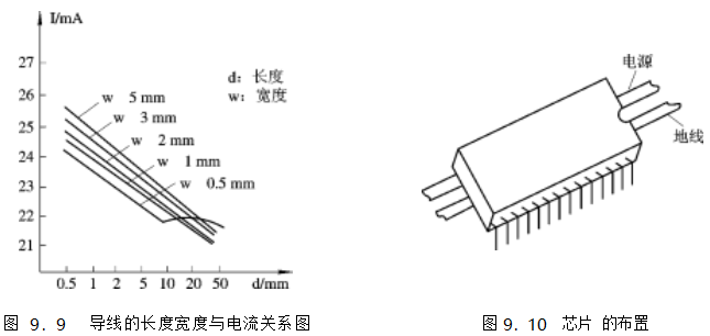印制板上的接地線根據(jù)電路通路最好逐漸加寬,并且不小于3 mm。圖9.9示出了導(dǎo)線的長(zhǎng)度、寬度和允許電流值之間的關(guān)系。