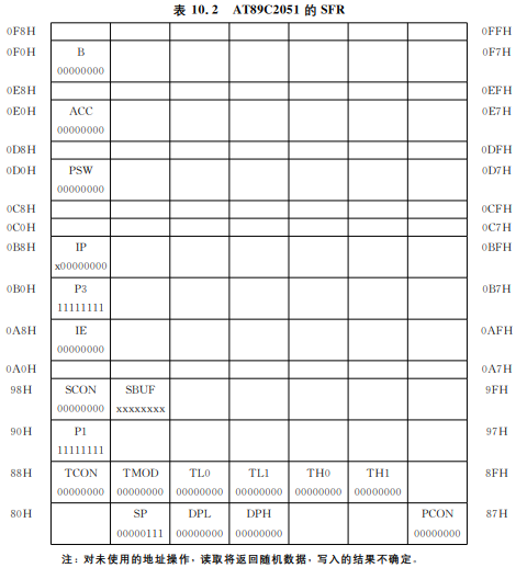 與8051單片機(jī)特殊功能寄存器相對應(yīng),AT89C2051片內(nèi)設(shè)置了19個(gè)特殊功能寄存器,統(tǒng)稱為特殊功能寄存器塊(SFR),它們的地址散布在80H~0F0H區(qū)域內(nèi)。表10.2給出了這19個(gè)SFR的名稱、地址和復(fù)位后的初值。