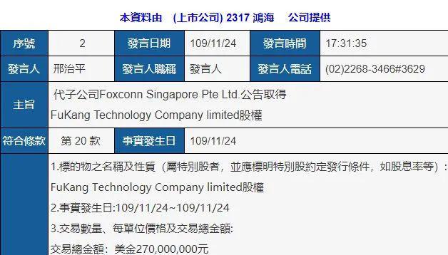 11月24日,鴻海發(fā)布公告稱,通過轉(zhuǎn)投資子公司,斥資2.7億美元成立新公司FuKang Technology Company limited。消息人士稱,這是為了布局越南,在原來的北江廠區(qū)附近再擴(kuò)廠。