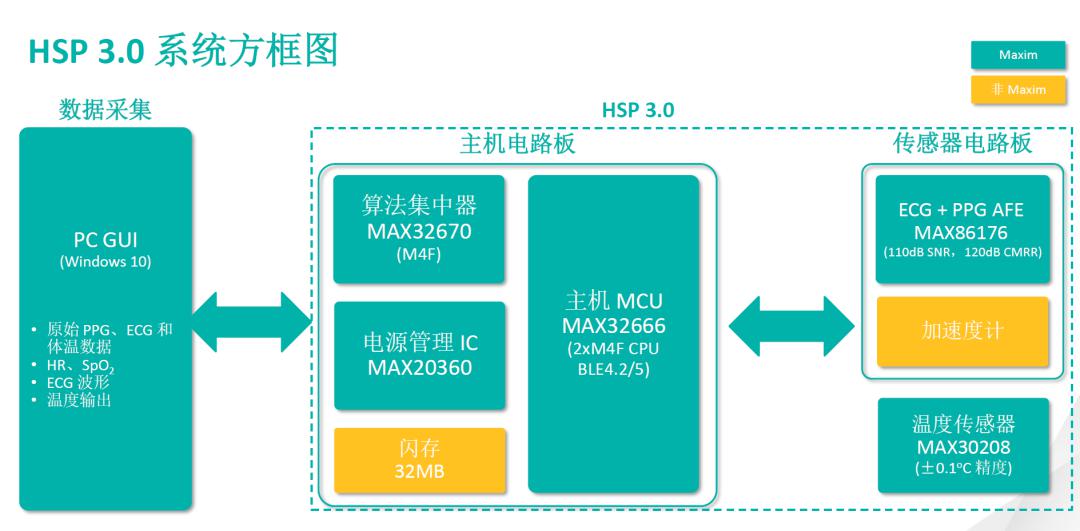 可穿戴醫(yī)療健康設(shè)備的普遍應(yīng)用,順應(yīng)了個性化互聯(lián)網(wǎng)醫(yī)療發(fā)展趨勢,持續(xù)使用可為個性化診療方案提供更精準(zhǔn)的參考,提升健康水平,以防代治減少用戶在醫(yī)藥、護理上的開支。Andrew Baker表示,美信一直關(guān)注醫(yī)療應(yīng)用領(lǐng)域,為簡化醫(yī)療設(shè)備開發(fā)難度,加快上市時間,早在2016年就推出了第一代健康傳感器平臺(Health Sensor Platform,簡稱HSP),2018年推出HSP 2.0,引入整機實時數(shù)據(jù)采集功能,今年則推出第三代HSP,即HSP 3.0。HSP 3.0除了繼承了兩代HSP平臺的優(yōu)點,HSP 3.0在集成ECG(心電圖)方案中增加了光學(xué)血氧SpO2測量和干電極的心電圖測量能力。因此,該平臺可以使終端方案監(jiān)測心臟和呼吸問題,用于管理慢性阻塞性肺疾病(COPD)、傳染病(例如新冠肺炎)、睡眠窒息癥和 房顫(AFib)等疾病。