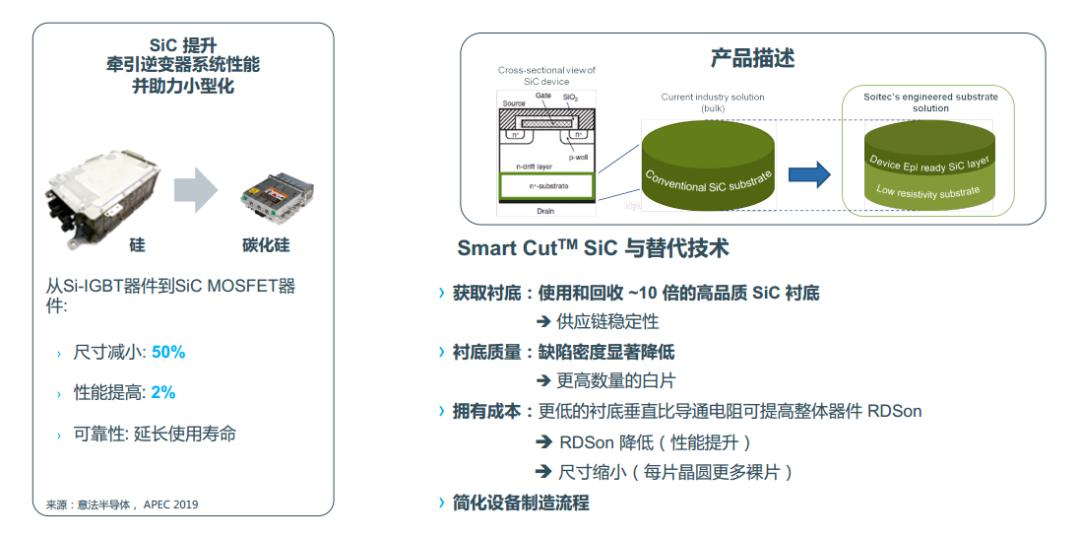 再回到碳化硅。與傳統(tǒng)硅IGBT器件相比,基于Smart CutTM的碳化硅襯底具有非常大的性能提升。首先,碳化硅主要應(yīng)用在逆變器中。逆變器是純電動(dòng)汽車動(dòng)力總成的核心部件,基于碳化硅的逆變器,其尺寸可減小50%,進(jìn)而減輕重量。此外,而且碳化硅耐高溫、耐高壓,所以性能非常穩(wěn)定,使用壽命也更長(zhǎng)。