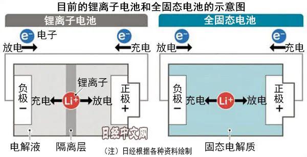 固態(tài)電池的充放電原理和液態(tài)電池相同,唯一不同的是它的電解質(zhì)為固態(tài),它相對于液態(tài)電解質(zhì)擁有諸多優(yōu)勢:1)能量密度高。固態(tài)電池采用固態(tài)電解質(zhì)后,就不需要使用嵌鋰的石墨負(fù)極,而是直接使用金屬鋰作為負(fù)極,這樣可以減輕負(fù)極材料的用量,從而提高整個電池的能量密度。2)體積小。傳統(tǒng)液態(tài)鋰電池中的隔膜和電解液占據(jù)了整個電池質(zhì)量的將近25%,采用固態(tài)電解質(zhì)后,正負(fù)極之間的距離可以縮短至最小的十幾微米,這樣電池的厚度和質(zhì)量都大大下降了。3)更高的安全性。傳統(tǒng)電池因為電解液為液體,在高溫狀態(tài)下可能會發(fā)生上述描述過的一系列安全隱患問題,而固態(tài)電池卻不存在這些問題,具有更高的安全性。