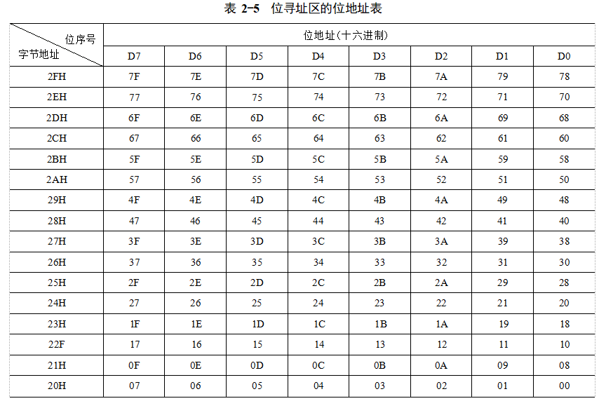 位尋址區(qū)的每個字節(jié)都有字節(jié)地址,可以通過直接尋址和寄存器間接尋址的方式訪問。另外,位尋址區(qū)中的每個位都有地址,即位地址,可以通過位尋址方式單獨訪問,見表2-5。