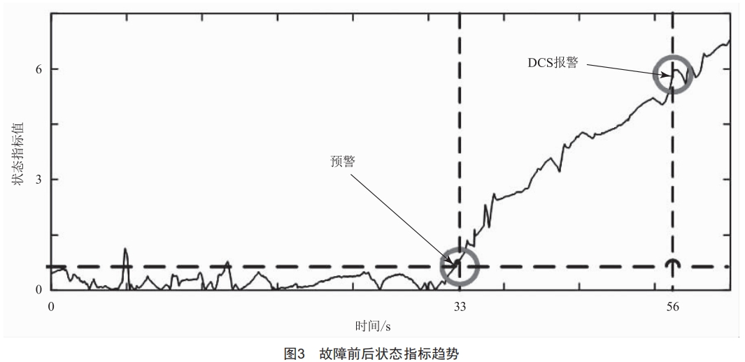 如圖3所示,實(shí)曲線代表指標(biāo)的變化趨勢(shì),可以看出,狀態(tài)指標(biāo)值在第33s達(dá)到預(yù)警限值,此時(shí)處于故障早期,泄漏量較小,各征兆參數(shù)的波動(dòng)小且未超DCS的報(bào)警限值,運(yùn)行人員難以發(fā)現(xiàn)異常。在故障后56s左右,DCS系統(tǒng)才發(fā)出超溫報(bào)警。顯然,預(yù)警信號(hào)對(duì)微小劣化的敏感度較高,對(duì)故障具有提前預(yù)警的作用。