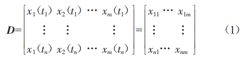 假設(shè)某一狀態(tài)向量的實(shí)時(shí)觀測值為xobs=[x1obsx2obs…xmobs]T,其對(duì)應(yīng)的標(biāo)準(zhǔn)歷史存儲(chǔ)矩陣為D,其中的一行代表某時(shí)刻的一個(gè)狀態(tài)值,矩陣的行數(shù)代表n個(gè)標(biāo)準(zhǔn)狀態(tài)值,列數(shù)代表狀態(tài)向量共有m個(gè)參數(shù),矩陣的形式如式(1)所示: