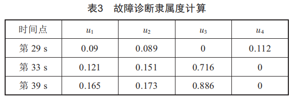 當(dāng)出現(xiàn)預(yù)警信號(hào)后,利用專家知識(shí)庫和模糊隸屬度函數(shù)求取各故障的隸屬度,由此確定具體的故障模式。表3是故障后各類故障隸屬度的計(jì)算結(jié)果,從中可以看出,隨著故障劣化程度的增大,當(dāng)前故障對(duì)u3的隸屬度呈現(xiàn)明顯的增加趨勢(shì)。實(shí)際上在預(yù)警信號(hào)出現(xiàn)后,診斷機(jī)制已經(jīng)正確判斷出發(fā)生了過熱器泄漏故障,隨著時(shí)間的推移,診斷結(jié)果的確定性加大,第39s的計(jì)算結(jié)果則進(jìn)一步確認(rèn)了故障模式。