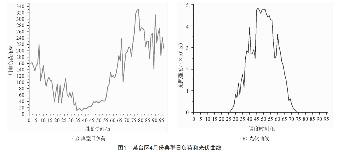 某臺區(qū)3月、4月炒茶季的典型日負荷曲線存在明顯的特點:夜間負荷顯著高于白天負荷,這是因為某臺區(qū)炒茶工作大多在夜間進行,使得該臺區(qū)炒茶點的臺區(qū)負荷與大多數(shù)臺區(qū)負荷不同。以4月份炒茶典型日為例,該臺區(qū)炒茶點4月炒茶季的最高負荷可達330kW,而該臺區(qū)炒茶點變壓器容量僅為315kW,若不使用儲能裝置、需求響應等措施,該臺區(qū)的變壓器會過載運行,容易受到損壞。該臺區(qū)4月份用電負荷情況以及光伏曲線如圖1所示。