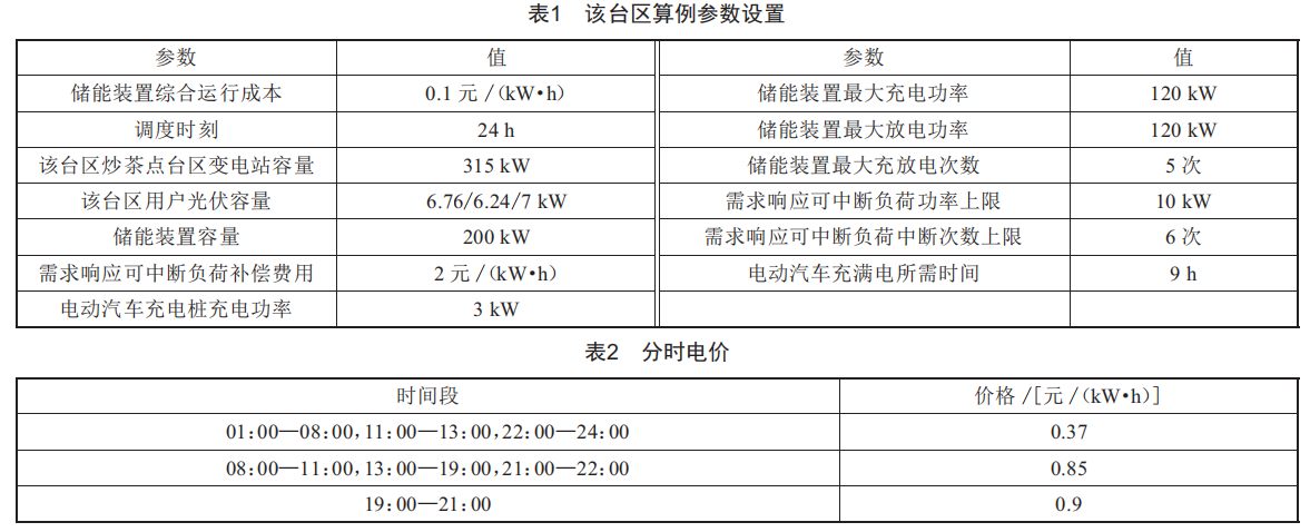 該臺區(qū)炒茶點的參數(shù)設置如表1所示,分時電價如表2所示,數(shù)據(jù)來源為浙江省電網(wǎng)銷售電價表(2020-02-01)。