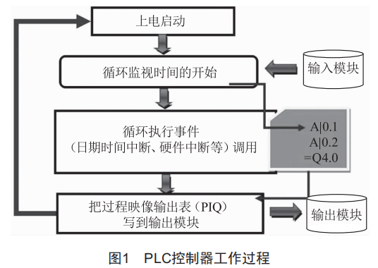 PLC是將微電子技術(shù)應(yīng)用于工業(yè)設(shè)備的產(chǎn)品,用軟件代替繼電器控制系統(tǒng)。PLC采用不斷循環(huán)的順序掃描工作方式,從輸入模塊讀取狀態(tài)信號(hào)放入過(guò)程映像區(qū),然后開(kāi)始調(diào)用循環(huán)。如果有事件產(chǎn)生中斷,則調(diào)用相應(yīng)的模塊進(jìn)行處理,最后把過(guò)程映像輸出表寫(xiě)到輸出模塊。具體工作過(guò)程如圖1所示。