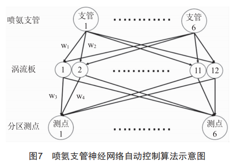 通過上述試驗可發(fā)現(xiàn),調整分支噴氨量,對應脫硝出口分區(qū)No王濃度變化最大,且呈發(fā)散性對附近的分區(qū)產生影響。因此引入神經網絡自動控制算法,對各噴氨支管調門進行實時調整,如圖7所示。