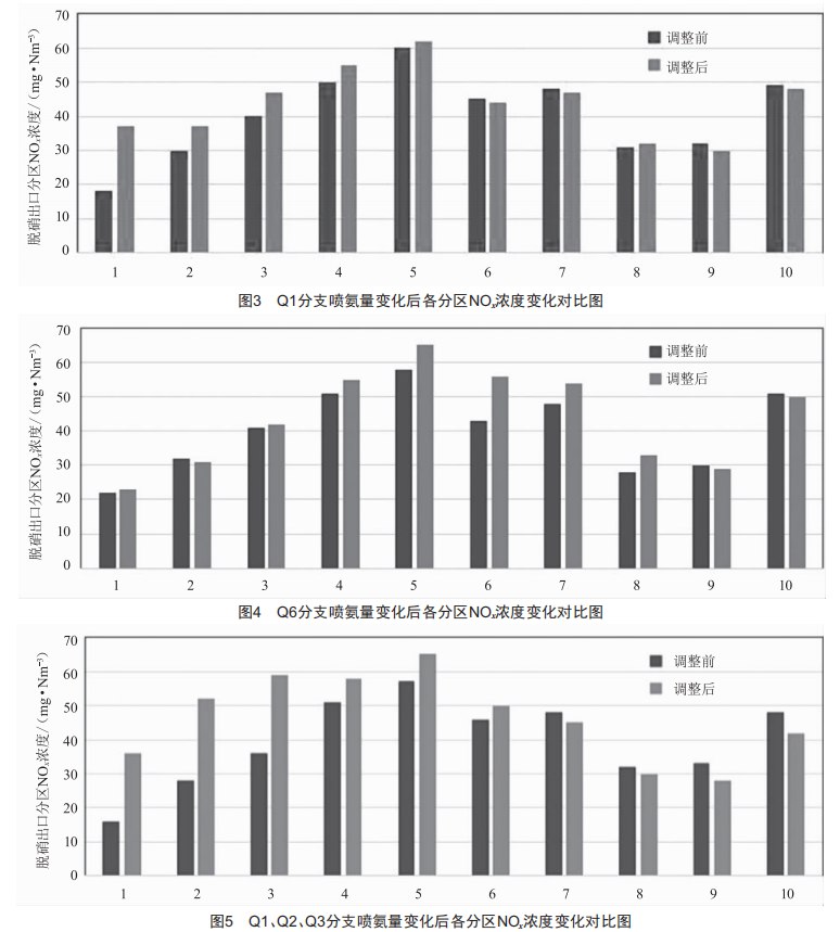 (1)將01、02、03分支噴氨調門開度由100%關小至60%,記錄調整前后脫硝出口各分區(qū)NoX濃度數據,如圖5所示。