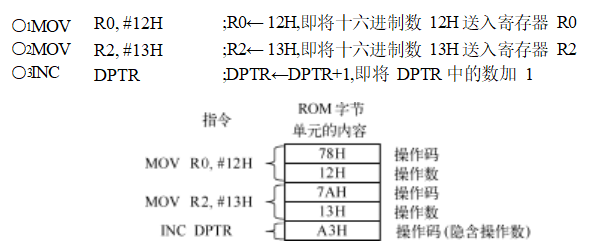 在指令“MOV A,#12H”中,立即數(shù)#12H是源操作數(shù),緊隨操作碼74H之后存放在ROM中。該指令執(zhí)行時,單片機先從ROM中讀取操作碼74H,對操作碼74H解碼后,確定要進行的操作是將一個8位立即數(shù)送入累加器A,接下來單片機從緊鄰操作碼的下一個存儲單元中取得立即數(shù)12H并送入累加器A。另外,該指令的目的操作數(shù)累加器A隱含在操作碼中,沒有明確給出。