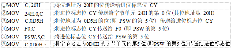 需要特別說(shuō)明的是,大多數(shù)書(shū)籍中將“MOV C,bit”和“MOV bit,C”歸入位操作指令,而本書(shū)將其與字節(jié)傳輸指令列入同一個(gè)表格,是為了便于進(jìn)行字節(jié)傳送指令和位傳送指令的對(duì)照,有利于讀者理解、記憶和區(qū)分這些指令。