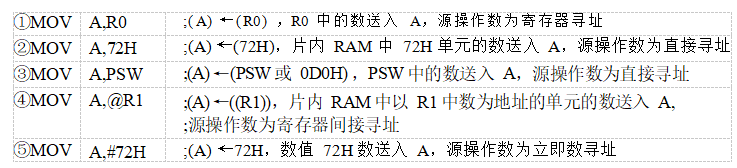 2)指令②和⑤中的源操作數(shù)的尋址方式不同,②中的72H前沒(méi)有“#”是直接地址,⑤中的72H前有“#”是立即數(shù)。