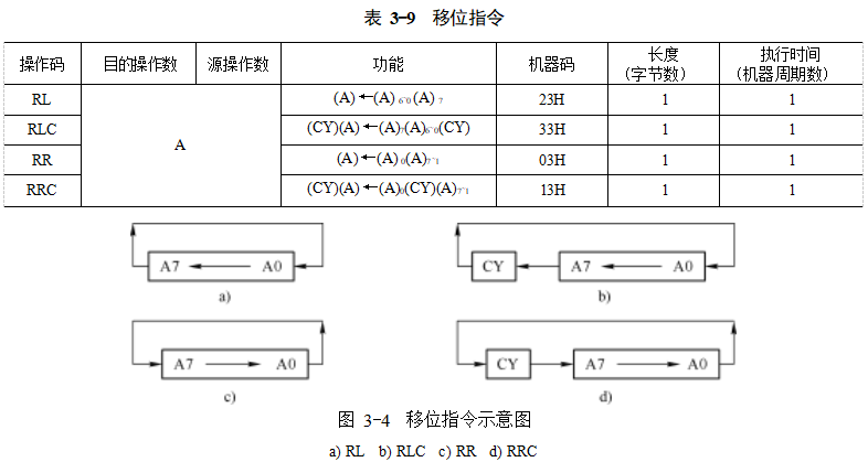 移位指令對其操作數(shù)進行循環(huán)移位,其指令語法格式見表3-9。二進制數(shù)向左移位一次相當于乘以2,向右移位一次相當于除以2。通過移位的方法進行乘、除法運算比使用MUL和DIV指令速度更快,因為MUL和DIV指令執(zhí)行時間是4個機器周期(見表3-7),而移位指令執(zhí)行一次僅用時1個機器周期(見表3-9)。圖3-4展示了移位指令的工作方式,結(jié)合表3-9可以更好地理解移位指令的功能。