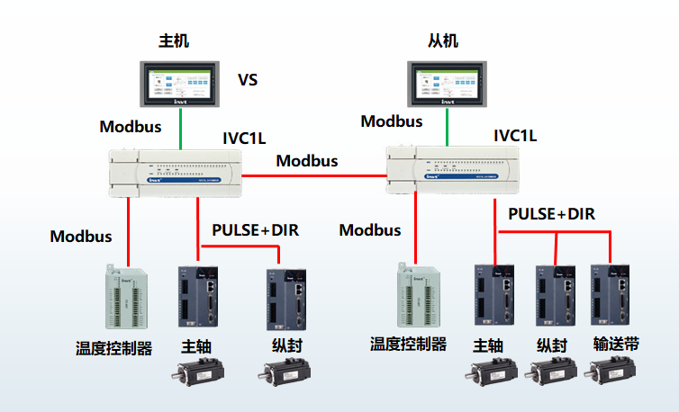 遼寧省錦州市某包裝機(jī)械有限公司,多年來(lái)以出色的藥品包裝機(jī)而被廣大用戶熟知。該司最新型的顆粒包裝機(jī)系統(tǒng)由主機(jī)和從機(jī)兩部分構(gòu)成,客戶預(yù)備升級(jí)改造設(shè)備的系統(tǒng)提升生產(chǎn)速度,讓主機(jī)和從機(jī)都能進(jìn)行藥品包裝,且要求包裝袋長(zhǎng)在5~9cm之內(nèi),切刀數(shù)可調(diào),每盒成品數(shù)量可調(diào)(3~7袋/盒),縱封、橫封、打字等部件的溫度可設(shè)。
