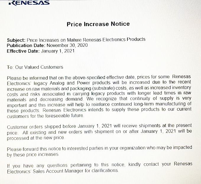 12月1日消息,日本半導(dǎo)體制造商瑞薩電子(Renesas Electronics)于11月30日向客戶發(fā)送了一封產(chǎn)品提價(jià)通知,提價(jià)生效日期為2021年1月1日。通知表示,由于原材料和包裝(基板)成本的增加,瑞薩電子擬將上調(diào)部分模擬和電源產(chǎn)品價(jià)格。