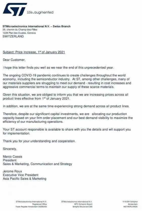 圖:2020年11月30日,一份由意法半導(dǎo)體發(fā)出的漲價(jià)函在坊間流傳