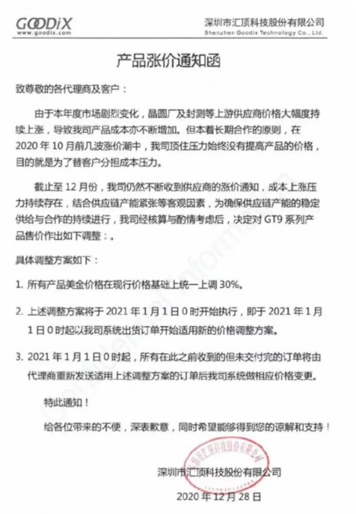 12月28日消息,匯頂科技在上交所發(fā)布澄清聲明表示,公司12月29日注意到國(guó)內(nèi)部分媒體發(fā)布或轉(zhuǎn)載關(guān)于公司將于2021年1月1日上調(diào)所有產(chǎn)品價(jià)格30%的不實(shí)報(bào)道。