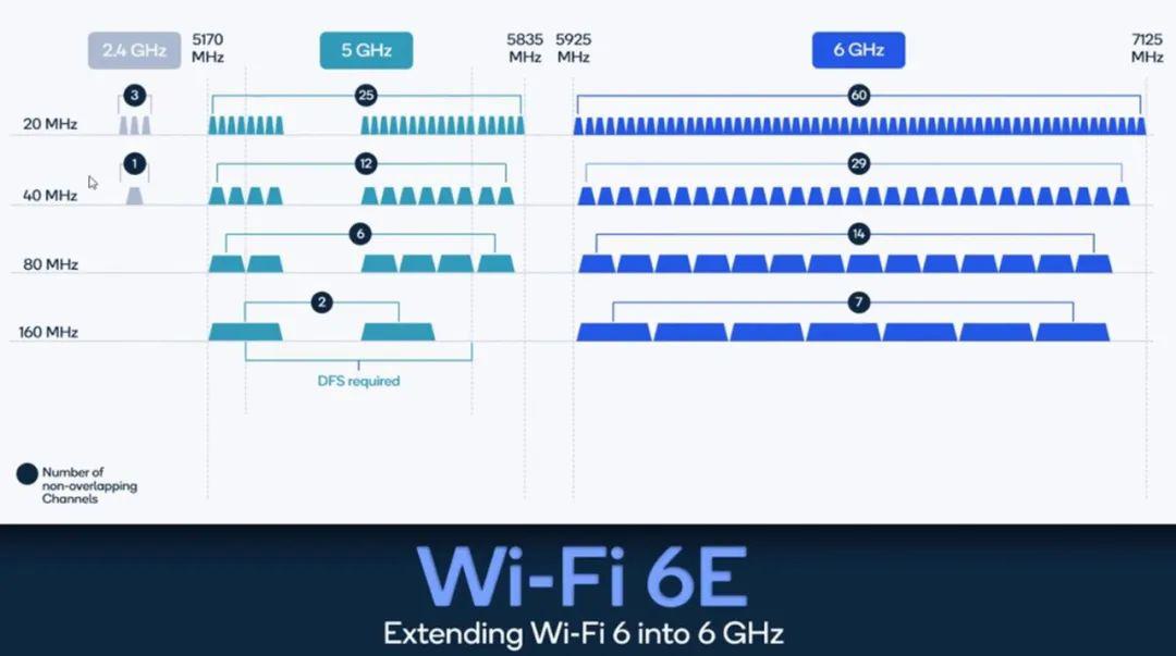 Wi-Fi 6E的E是(Extended,擴充)的意思,可以被視為在6GHz載波上運行的Wi-Fi 6,即將Wi-Fi 6從原有2.4GHz和5GHz載波頻段擴充到支持6GHz載波頻段。目前,Wi-Fi聯(lián)盟推動的Wi-Fi 6E頻譜規(guī)劃為5925-7125MHz之間,共計1200MHz,包含7個160MHz信道、14個80MHz信道、29個40MHz信道、60個20MHz信道,總計110個信道,相比較5Ghz的45以及2.4Ghz的4個信道,容量更大,吞吐量大幅提升。