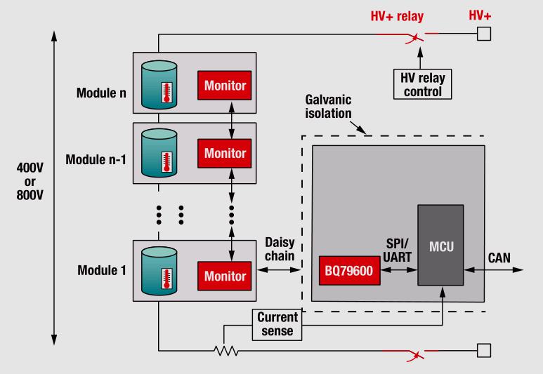 為了使電池組保持在安全工作范圍,可以使用電池監(jiān)測ASIC(專用集成電路)來測量電壓、溫度和電流,并將數(shù)據(jù)傳輸?shù)诫姵乜刂茊卧?。電池單元電壓和溫度傳感器連接到電池監(jiān)測ASIC;控制處理器通過讀取測量信息來計算電池的當(dāng)前狀態(tài),確保操作在安全范圍內(nèi)進(jìn)行。對于高壓電池組,監(jiān)控ASIC以堆疊配置排列,每個ASIC并行測量多個單元。命令和數(shù)據(jù)通過一個隔離通信接口從ASIC傳輸?shù)紸SIC。