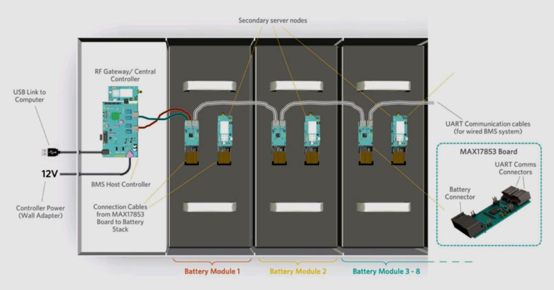 2020年初的CES(國際消費(fèi)類電子展)上,Maxim Integrated(同年7月ADI宣布對其收購)演示了無線BMS,通過取代電池組和BMS模塊間的傳統(tǒng)有線連接,減輕了電線和連接器重量,消除模塊間隔離組件降低了成本、制造復(fù)雜性并縮短制造時間,電池組形狀也更加靈活。