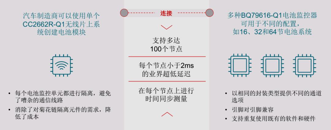 考慮到主機(jī)廠的長期設(shè)計需求,無線BMS創(chuàng)新技術(shù)還提供更高的可擴(kuò)展性。專有協(xié)議可提供市場上最高的吞吐量,使主機(jī)廠能夠在不同電池配置中(如32、48和60個電池單元的系統(tǒng)等)將采用單個無線片上系統(tǒng)的電池模塊與多個BQ79616-Q1電池監(jiān)視器相連。這樣的系統(tǒng)設(shè)計支持多達(dá)100個節(jié)點(diǎn),每個節(jié)點(diǎn)都達(dá)到業(yè)界最低延遲(低于2ms),且每個節(jié)點(diǎn)的測量均可實(shí)現(xiàn)時間同步。