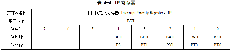 (4)中斷優(yōu)先級別和中斷嵌套MCS-51單片機僅有兩個中斷優(yōu)先級別,即高級和低級。中斷源的中斷優(yōu)先級別由中斷優(yōu)先級寄存器IP(見表4-4)決定。IP寄存器各位的定義如下: