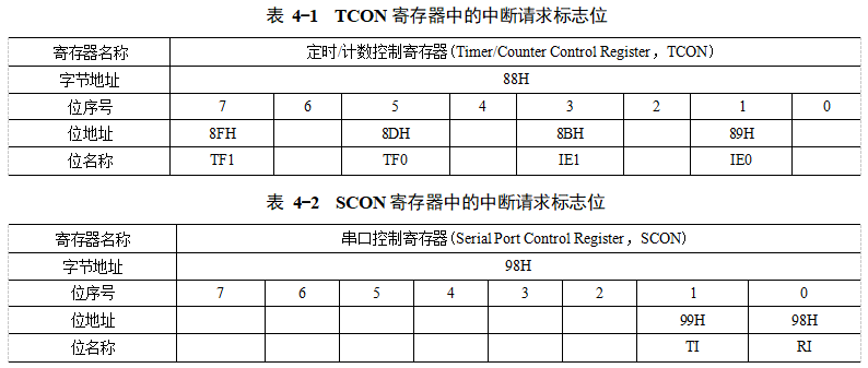 單片機給每個中斷事件分配了一個中斷請求標志位,當某一中斷源發(fā)出中斷請求時,其對應的中斷請求標志位被置1,以表示該中斷發(fā)出了中斷請求。外部中斷INT0和INT1、定時/計數(shù)器T0和T1以及串口發(fā)送中斷和接收中斷的中斷請求標志位分別為IE0、IE1、TF0、TF1、TI和RI,這些中斷請求標志位分別存放在定時/計數(shù)器控制寄存器TCON(見表4-1)和串口控制寄存器SCON(見表4-2)中。