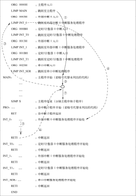 圖4-3是一個(gè)包含中斷服務(wù)處理程序的典型程序結(jié)構(gòu)框架。該圖中的箭頭展示了從主程序執(zhí)行、單片機(jī)暫停主程序、跳轉(zhuǎn)至外部中斷0中斷服務(wù)程序直至返回主程序的全過程。其中,實(shí)線箭頭是主程序執(zhí)行過程;虛線箭頭是中斷服務(wù)處理程序的執(zhí)行過程;空心圓圈代表中斷發(fā)生的位置,即斷點(diǎn)的位置。