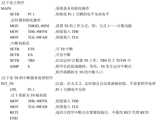 因?yàn)椴贿M(jìn)行引腳電平的測(cè)量,所以GATE=0;使用計(jì)數(shù)功能,所以C/T=1;工作于方式1,所以M1M0=01。本程序與T1無關(guān),所以TMOD的高4位可全部為0。因此TMOD=05H。