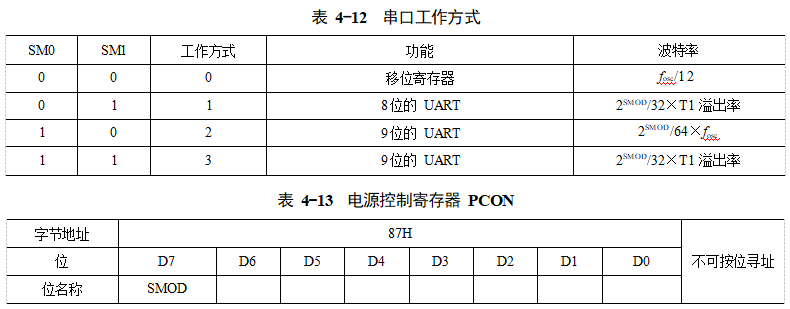 串口有4種工作方式,由SM0和SM1選擇,見表4-12。在表4-12中: