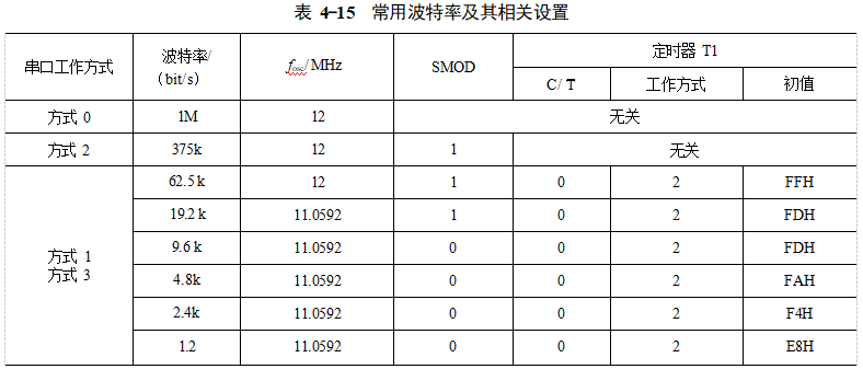 表4-15給出了常用波特率及其相關(guān)設(shè)置,編程時(shí)可以通過查表的方式獲得定時(shí)器T1初值。另外,在計(jì)算波特率時(shí),若晶振頻率為11.0592MHz,則可以得到精確的T1初值(不會(huì)產(chǎn)生小數(shù)值),因此頻率為11.0592MHz的晶振在單片機(jī)系統(tǒng)中經(jīng)常被采用。