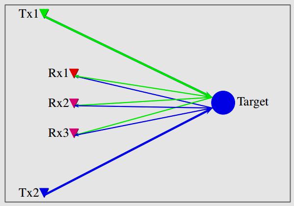 多個發(fā)射和接收天線的雷達系統(tǒng)被稱為多輸入多輸出(MIMO)雷達系統(tǒng),它包括兩個發(fā)射天線和三個接收天線。每個接收機需要知道來自Tx1和Tx2的信號的定時。因此,雷達系統(tǒng)創(chuàng)建了6個虛擬接收機系統(tǒng)(即2(Tx)x 3(Rx)=6個虛擬接收機)。