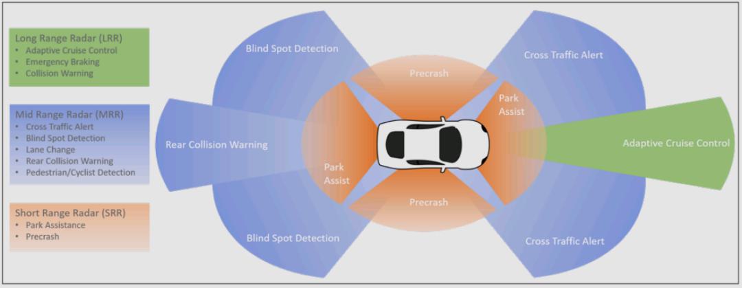 SRR可以在短距離內(nèi)檢測寬角度區(qū)域內(nèi)的物體,通常用于泊車輔助、十字路口交通警報、行人/自行車檢測、追尾警告和車道變換輔助。