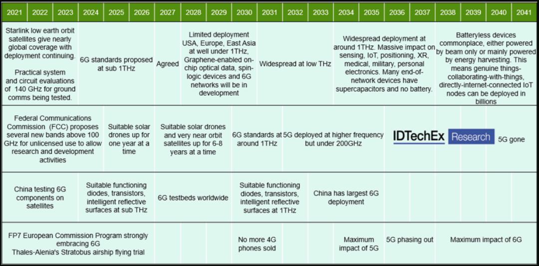 所有研究項(xiàng)目都是開發(fā)知識(shí)庫(kù)、試驗(yàn)和原型的關(guān)鍵。IDTechEx最近的“2021-2041 6G通信市場(chǎng)、設(shè)備和材料”報(bào)告預(yù)測(cè)了6G路線圖以及一些挑戰(zhàn)和機(jī)遇。