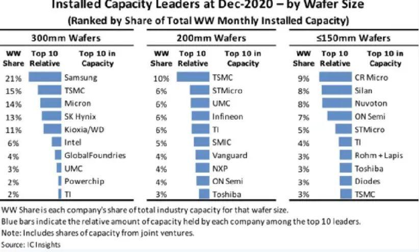 市場研究機構(gòu)IC Insights發(fā)布簡報,列出當前晶圓產(chǎn)能。其中12寸(300毫米)晶圓產(chǎn)能排名,三星高居榜首,臺積電排名第二,美光、SK海力士和鎧俠分列三至五,前五名中有五家是全球最重要的存儲器廠商。