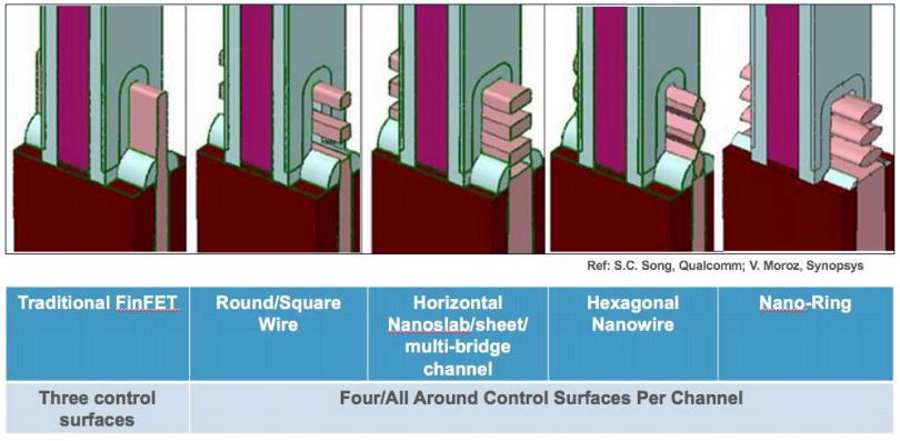 研發(fā)中的GAA架構(gòu)有幾種類型,供應商主要關(guān)注的是納米片F(xiàn)ET?;旧?,納米片F(xiàn)ET是一個側(cè)面有柵極包裹的FinFET,能較低的功率實現(xiàn)更高性能的芯片。
